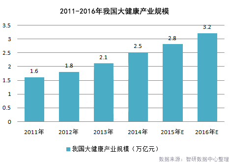 我国大健康产业由医疗性健康服务和非医疗性健康服务两大部分构成,已形成了四大基本产业群体:以医疗服务机构为主体的医疗产业,以药品、医疗器械以及其他医疗耗材产销为主体的医药产业,以保健食品、健康产品产销为主体的保健品产业,以个性化健康检测评估、咨询服务、调理康复、保障促进等为主体的健康管理服务产业。与此同时,我国大健康产业的产业链已经逐步完善,新兴业态正在不断涌现,健康领域新兴产业包括养老产业、医疗旅游、营养保健产品研发制造、高端医疗器械研发制造等。我国的健康服务业刚刚起步,随着人口老龄化和城镇化加速,未来市场前景广阔,据估算,2013年,我国大健康产业规模预计接近2万亿元,到2016年,规模将接近3万亿元,达到全球第一。2014年多项国家级项目完成了产品转化并将于2015年投入使用,同时,我国大健康产业近年来的蓬勃发展充分反映了人民正迫切期待多元化、个性化的健康服务。